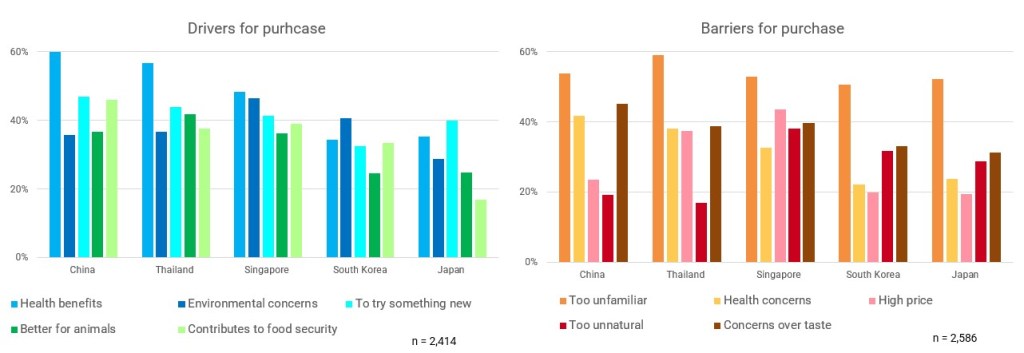 We can see that the health benefits are the biggest driver in China and Thailand, while in Singapore and South Korea, environmental concerns are the biggest driver. In Japan, it’s to try something new. We can see that safety concerns also ranked highly across all markets and this included examples such as to avoid animal borne disease.
